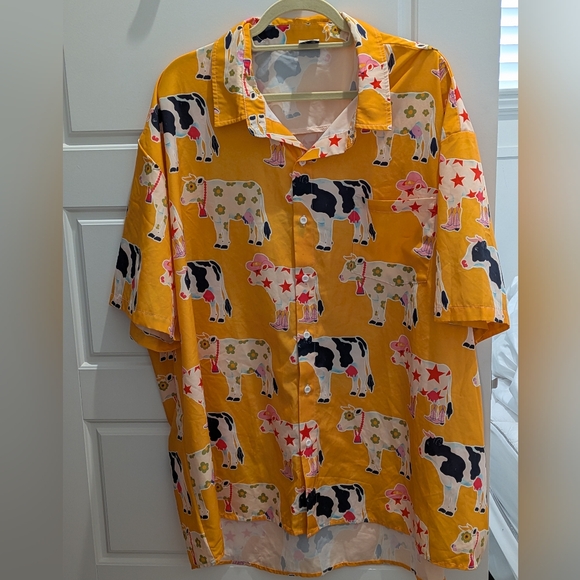 Add some personality to your wardrobe with this vibrant and unique HARDADDY button-down shirt. Perfect for summer, festivals, or just making a statement, this shirt features a playful all-over cow print with fun western details.