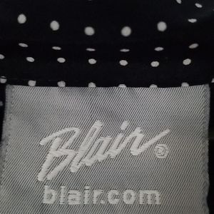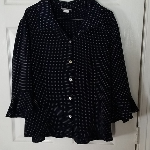 Dark Blue with white polka dots button down blouse with 3/4 length ruffled end sleeves