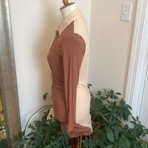 Form fitting and stretchy, two tone, button down dress.