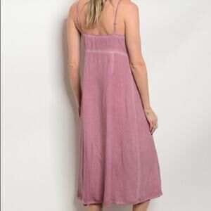 Rose colored washed dress with button detail and v neckline. Cutout tie front at waist. 85% viscose, 15% rayon. Unlined with adjustable straps.