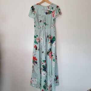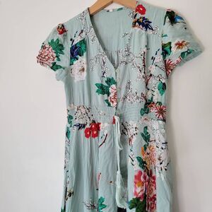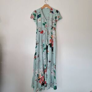Button Down Floral Dress Blue Maxi Short Sleeve Waist Tie Small