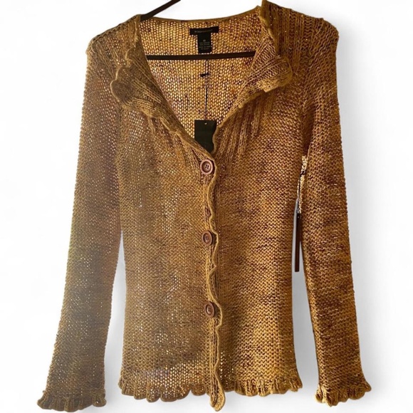 New with tags, dark beige color, large wooden buttons acrylic/nylon, never worn except for photo