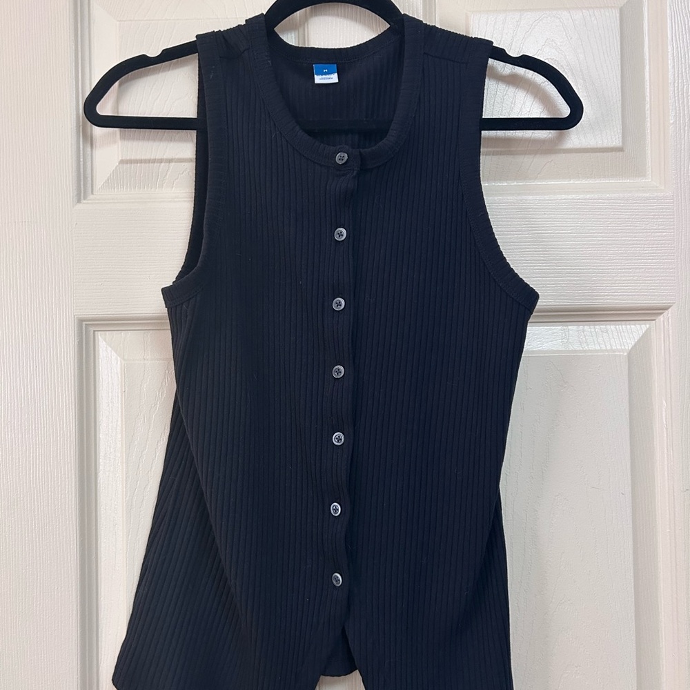 Black sleeveless button-down top. Slim fit, hits at hip. Perfect for any occasion!