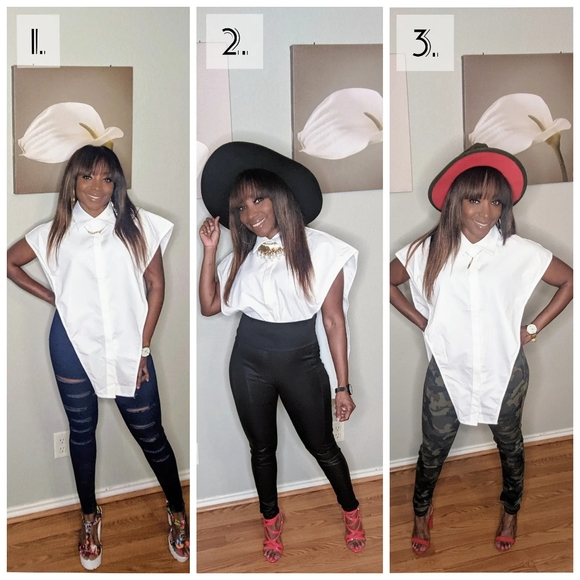 Show me what you're working with in this "What's your Angle?" top! This white, button-down sleeveless shirt is EVERYTHING!!! It gives us a distinctive, unique, yet peculiar style and you must have this one in your closet sis! True to size. Model is wearing a small.