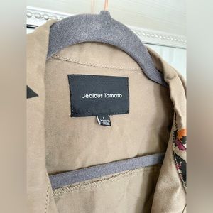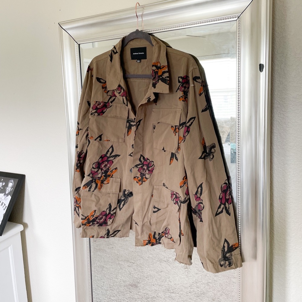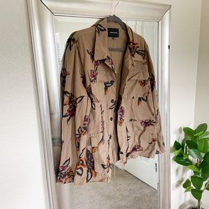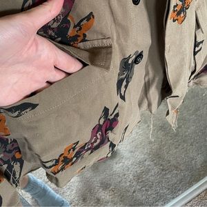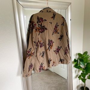 NWOT, very lightweight button down jacket, green/brown w/multicolored florals, breast & side pockets