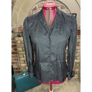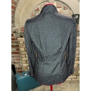 Button down blouse with shawl collar great abstract confetti pattern and bracelet sleeves with fold over cuffs. fabric covered buttons. attached skinny scarf.