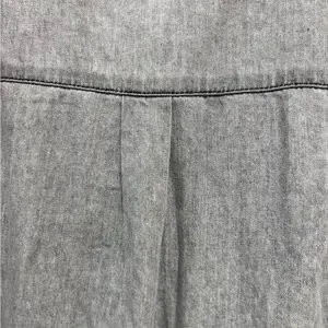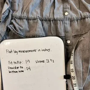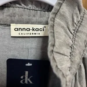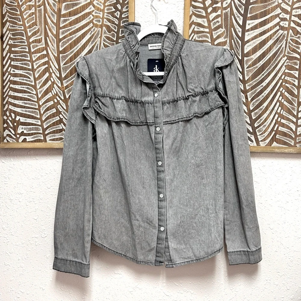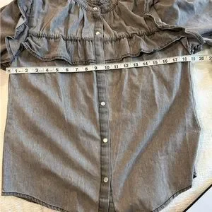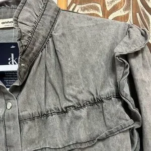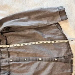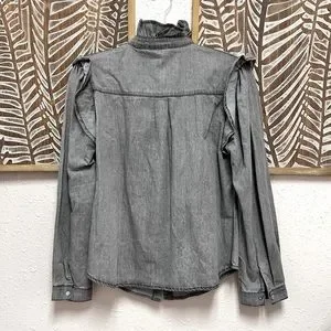 This is a beautiful, feminine, pearl snap button down with ruffled neck and ruffle details throughout, in a washed out black color. It is new with tags and absolutely adorable!