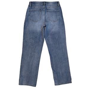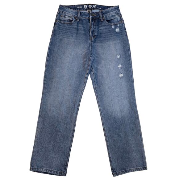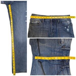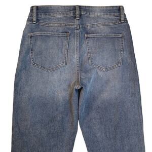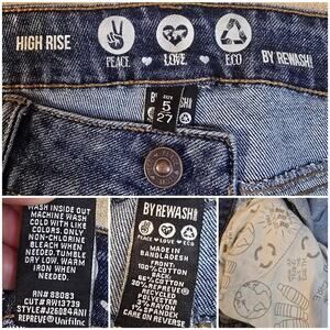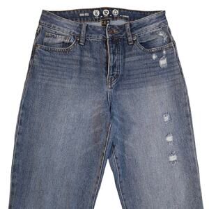 Medium wash denim w/ factory fading, sanding,whiskering,distressing. Front half is 100% cotton denim. Back half is a cotton blend wuth a little stretch. 5 pocket, button fly, high rise silhouette w/ cropped ankle length hems. Excellent preowned condition. Size 5/27 by ReWash brand.
