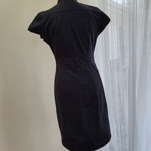 H&M cap short sleeve vneck button front coat dress. Washed black cotton/elastane. Faux breast pockets, 2 working front hip pockets with flaps. Belt loops at waist, no belt. Center back kick slit. Measures 17" underarm seam to seam. 14" waist flat. 36" from top of shoulder to bottom hem. Size 8.