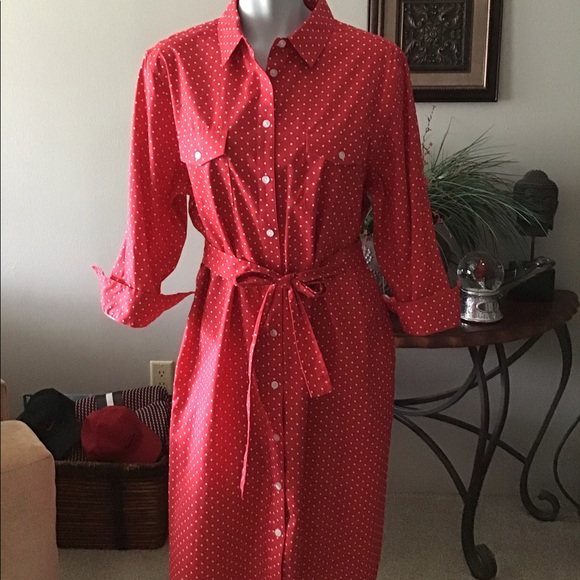 Washed this dress and NEVER wore it! Tried on but never wore it out. Nice quality! Red with white dots. This dress has chest AND side pockets. 3 inch slits each side