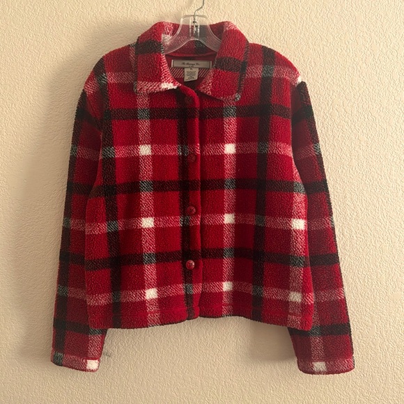 Red, black and white heathered plaid fleece collared button front jacket. Size is XL but looks great oversized, too!