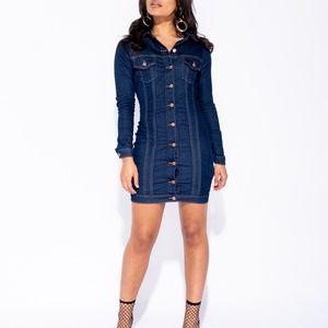 Discover the ultimate dress we are loving this season! This stretch denim dress featuring button front & long sleeves teamed with heels will give you a show stopping figure-hugging look for a night out!