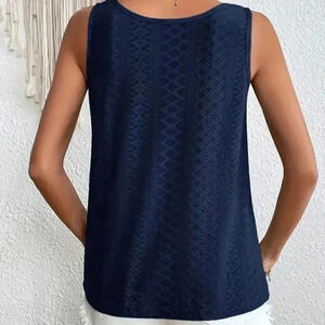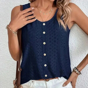 This comfy dark blue tank top is a wardrobe essential for spring and summer. Featuring a classic crew neck and functional button-front design, it offers a touch of detail and keeps you cool on warm days. The flattering fit (size 4) makes it versatile for layering or wearing on its own. Pair it with jeans, shorts, or a skirt for a casual and put-together look. The soft material drapes nicely and is comfortable for all-day wear.