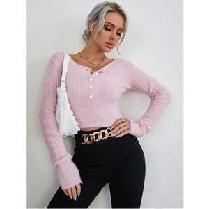 Button Front V-Neck Pink Fuzzy Crop Sweater