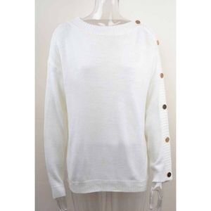 Chic buttoned sleeve knit sweater. Cozy knit shapes this sweater top that boasts a boat neck, one of the sleeves covered with buttons from the shoulder to cuff, and a relaxed bodice with a wide cut hem. Ribbed knit accents the cuffs, hem, and neckline.