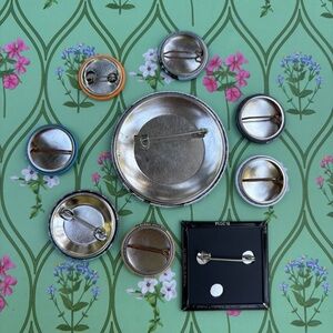 Random assortment of 9 button pins collection. Pins include an anchor, a Toronto pin, fairy princess pin, a honky tonk cowboy hat pin, tie dye “literally” pin, Los Angeles “LA” pin, James Mae tour (from the retro style t-shirt company), square Sgt. Pepper’s Band Beatles pin, and a large smiling Marilyn Monroe pin.