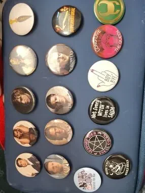 Assorted collectible button pins featuring Supernatural characters and themed designs. Includes character portrait pins and slogan/graphic pins. Great for jackets, bags, and collections. Colorful set with dominant navy blue background on pin holder. pins include some witchy pins some girl positive pins some marvel pins some book pins some umbrella academy pins American horror story pin and supernatural pins. I have no proof but all of these pins were purchased in Manitou springs Colorado so that's a little fun fact for whoever buys them. Manitou springs has one of the largest witch populations in the US