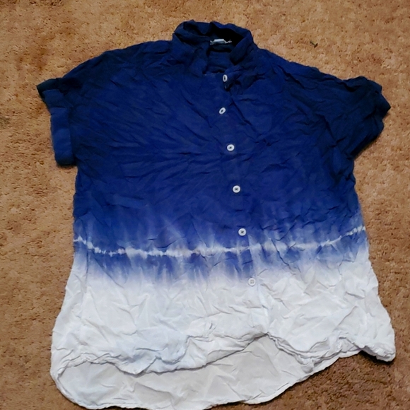 A very stylish, short sleeve button shirt with a tie dye design near the bottom.