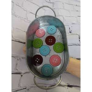 Large metal tin with colorful buttons and clear resin
