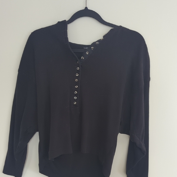tags cut out. collar shirt feel. buttons go halfway down. has a balloon cut. 3/4th sleeve smoke free pet friendly home