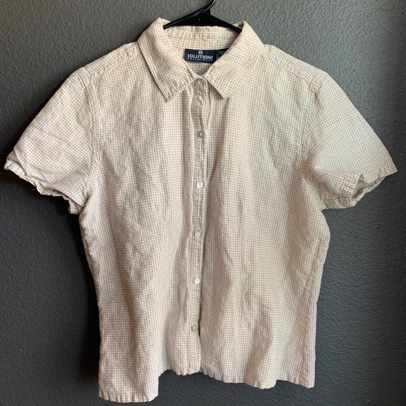 Tan and cream plaid short sleeve button up. Says size large but fits like a small.