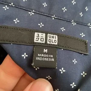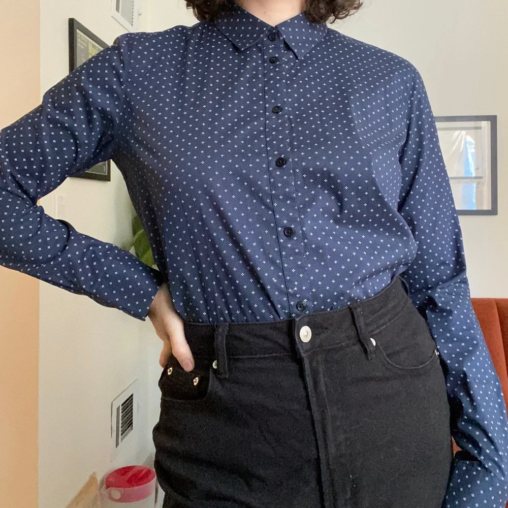 Uniqlo button up with small print size M but could fit a broad shouldered S - only worn once - structured material but not uncomfortably stiff - slight slimming waist - can be worn tucked in or not - Uniqlo Banana Republic Target