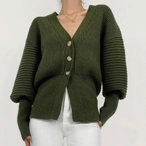 Button Up Balloon Sleeve Ribbed Knit Cardigan in Olive Green - Size S