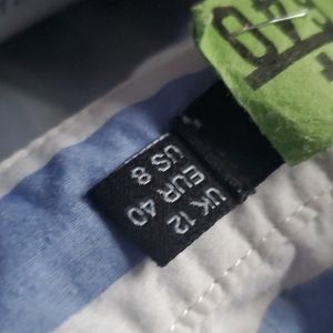 White and light blue stripe balloon sleeve top. Fits a MEDIUM.