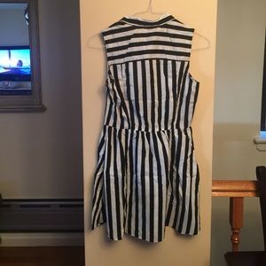 This dress is a white and black striped, button up fit and flare dress. The dress has an elastic waste. It is very light weight so it is perfect for summer or even can make a cute bathing suit cover up.
