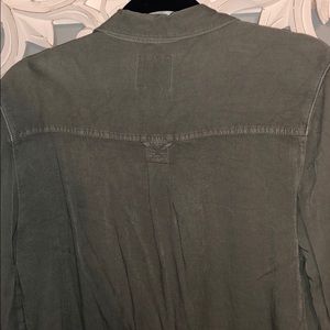 Green button up shirt that can be worn in multiple ways! Can be worn unbuttoned as a cute light jacket or buttoned up and tucked into high waisted pants. I