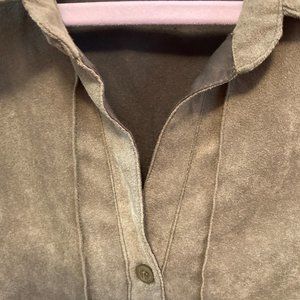 Very pretty dark greet button-up collard shirt. Can be worn with a top underneath as a layered look. Feels and looks like suede.
