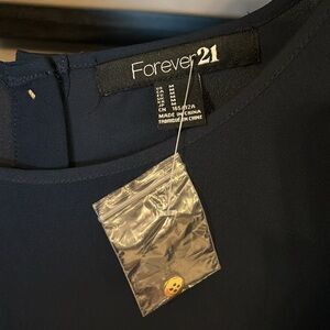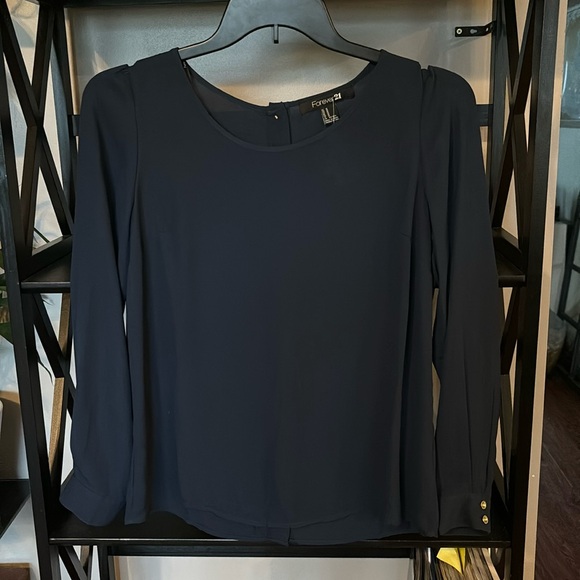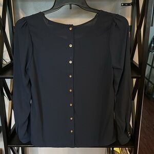Navy blouse with gold tone buttons down back and at wrist cuffs. Never worn, still has extra button attached at size tag.