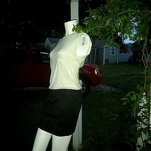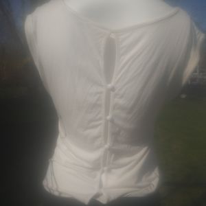 NWOT cream white and black T-shirt dress. The skirt has pockets and a little stretch to it and the top as open buttons that go down the back and is drapey like a t-shirt and has a pocket on the front. Is truly a beautiful dress. No rips no stains no imperfections size large