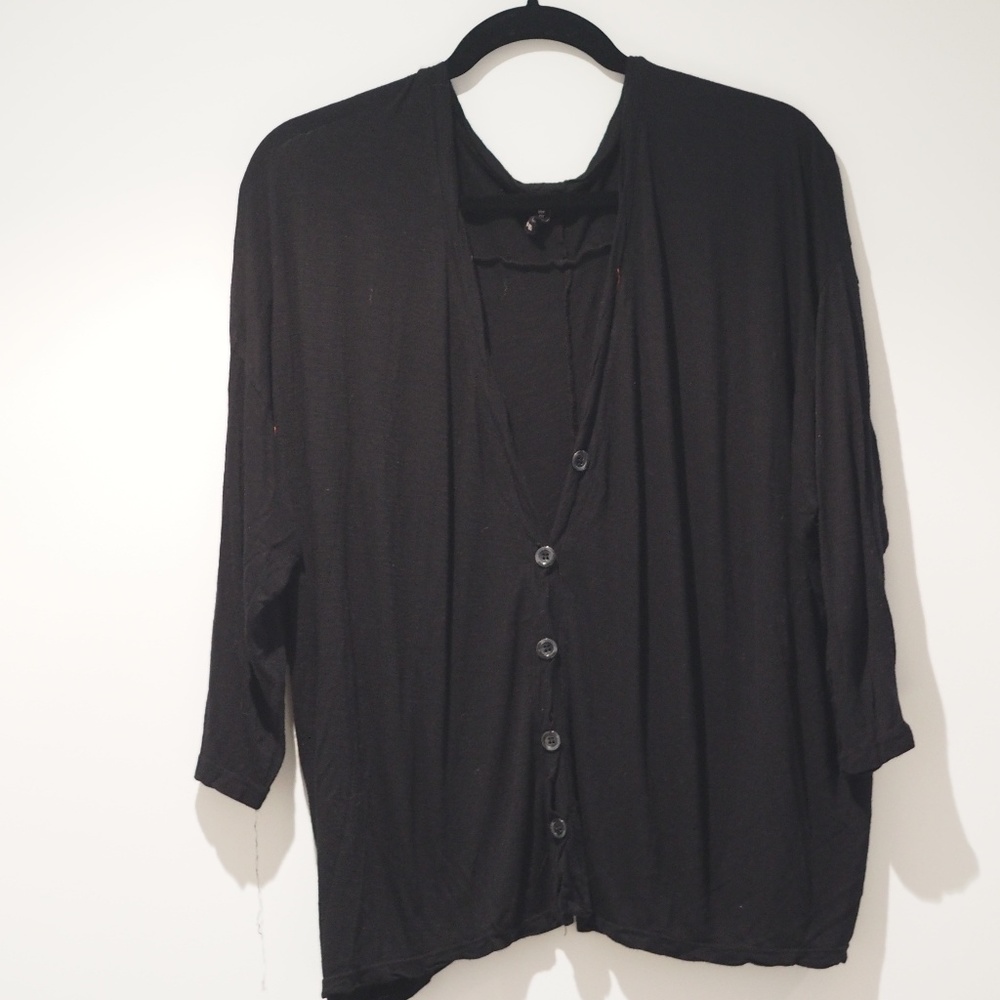 Easy breezy black button down, soft- perfect for hanging around the house or dressing it up with a lacy camisole! Can be worn buttoned up or as a cardigan.