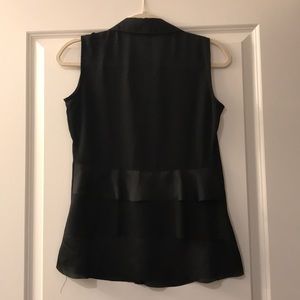 Sheer black collared cardigan perfect for layering! Silver buttons down the front with black rhinestone detailing on chest. Three tiered ruffles on bottom back half. Perfect for adding style to the office wardrobe!