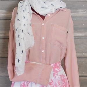 salmon colored button down dress shirt. The material is really soft. Size Medium.
