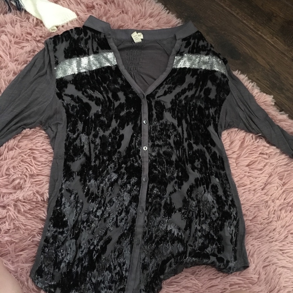 Super soft detailed dark gray area on top of just plain light gray long sleeve. Sleeves are adjustable
