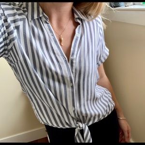 Dark grey and white button down with short sleeves. Cute front tie detail- can be adjusted to shorter length! Never worn, without tags. Fits S/M.