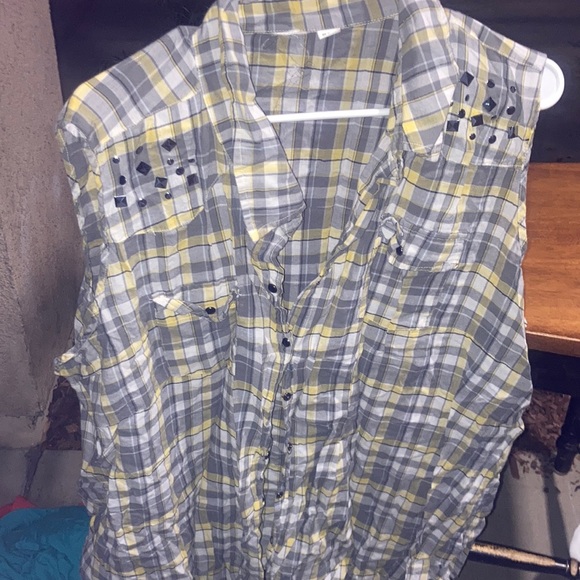 Yellow and grey button down muscle top. This top is pretty long. Size 26/28