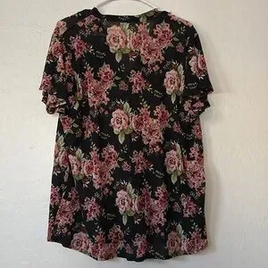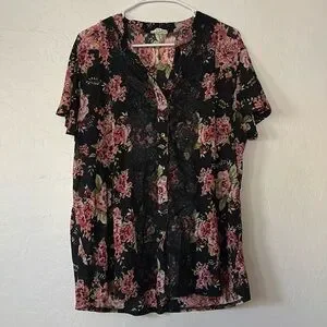 Beautiful button-down floral short sleeve shirt, thin . Green , Little bit of red and pink . Has black lace going from by the v neck down the middle of the shirt towards the bottom . Can be used as an “ over “ shirt . Worn over a tank top or by its self .