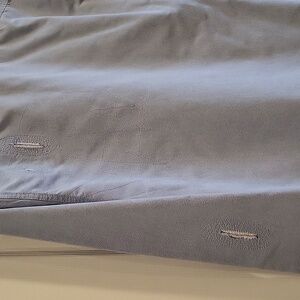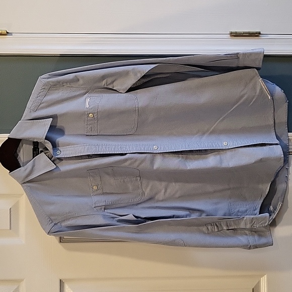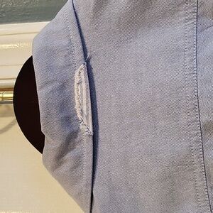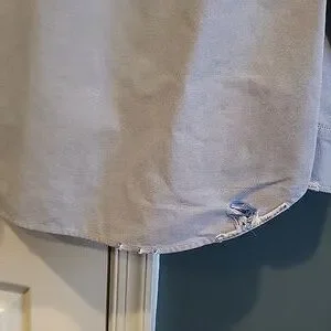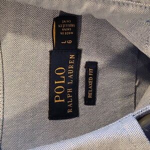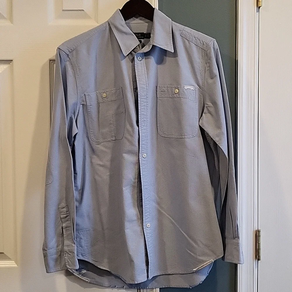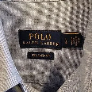 Ralph Lauren denim button down long sleeve. size large. relaxed fit. hole/tear is the style of the shirt