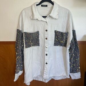 Light denim wash sparkle sleeve shirt! #nightout