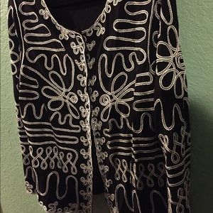 This is black and white braids. It would look great with a pair of slacks. It is not lined so it will make a great layering piece.