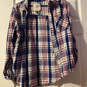 Button down striped plaid shirt with long sleeves perfect for a light covering. Goes well with/without tanktop underneath.Has red, white and blue colors across the shirt.