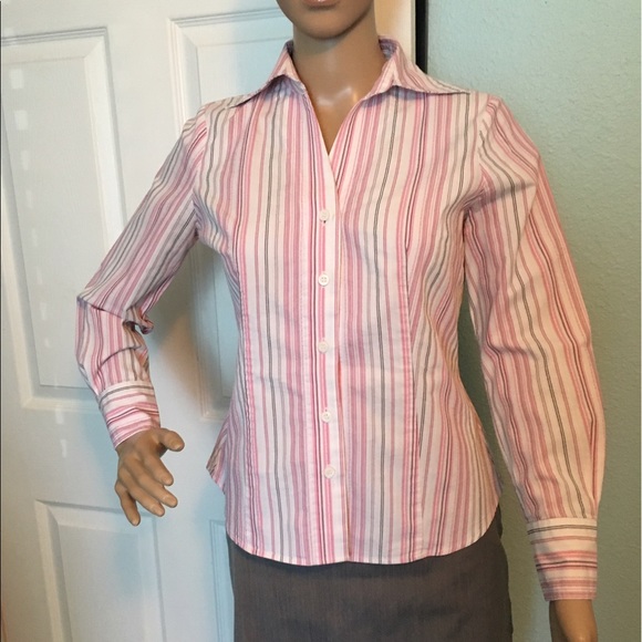 Pink, grey, and black striped blouse. Tailored at the waist, stretch fabric. Looks amazing with slacks or a pencil skirt. (Skirt in picture not included)