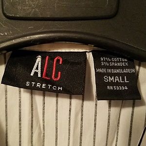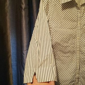 White 3/4 sleeve button down blouse with black strips. Fits more like a medium. In GUC. Bundle and save.
