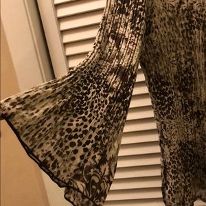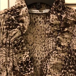 Brown patterned button down textured blouse. Arms are 3/4 length with flare. Size large. Smaller ruffle collar never been worn.