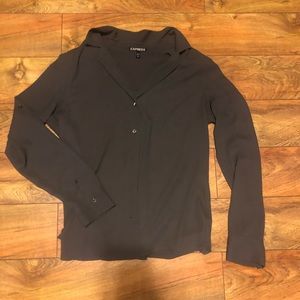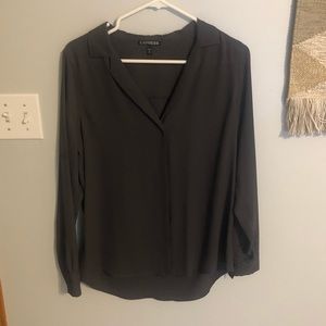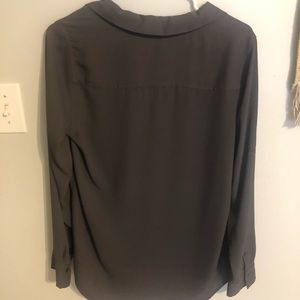 This top is a charcoal grey color and is a silk material. All buttons are attached and the top is in great condition.