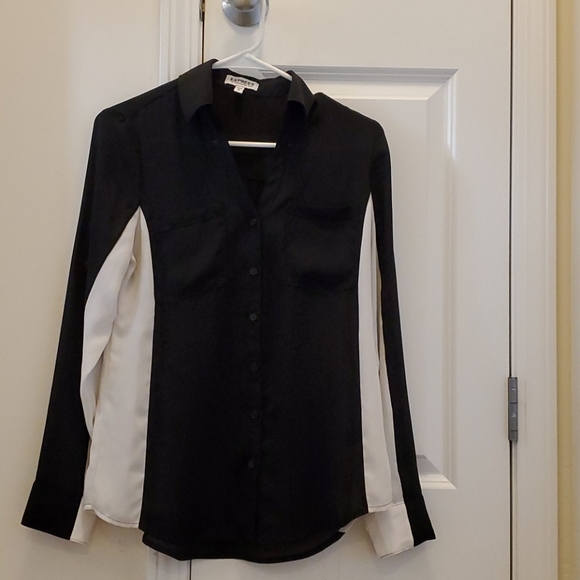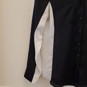 Express button down blouse, polyester, buttons on side allow to roll sleeves up