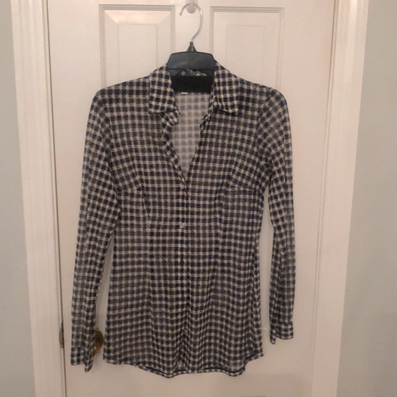 Sheer blue and white check gingham, button down, to be worn with a cami underneath